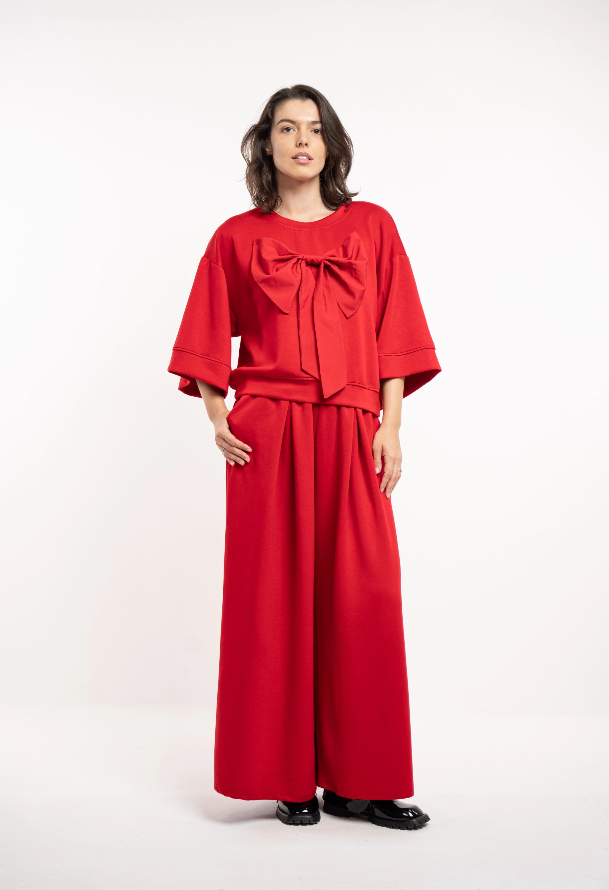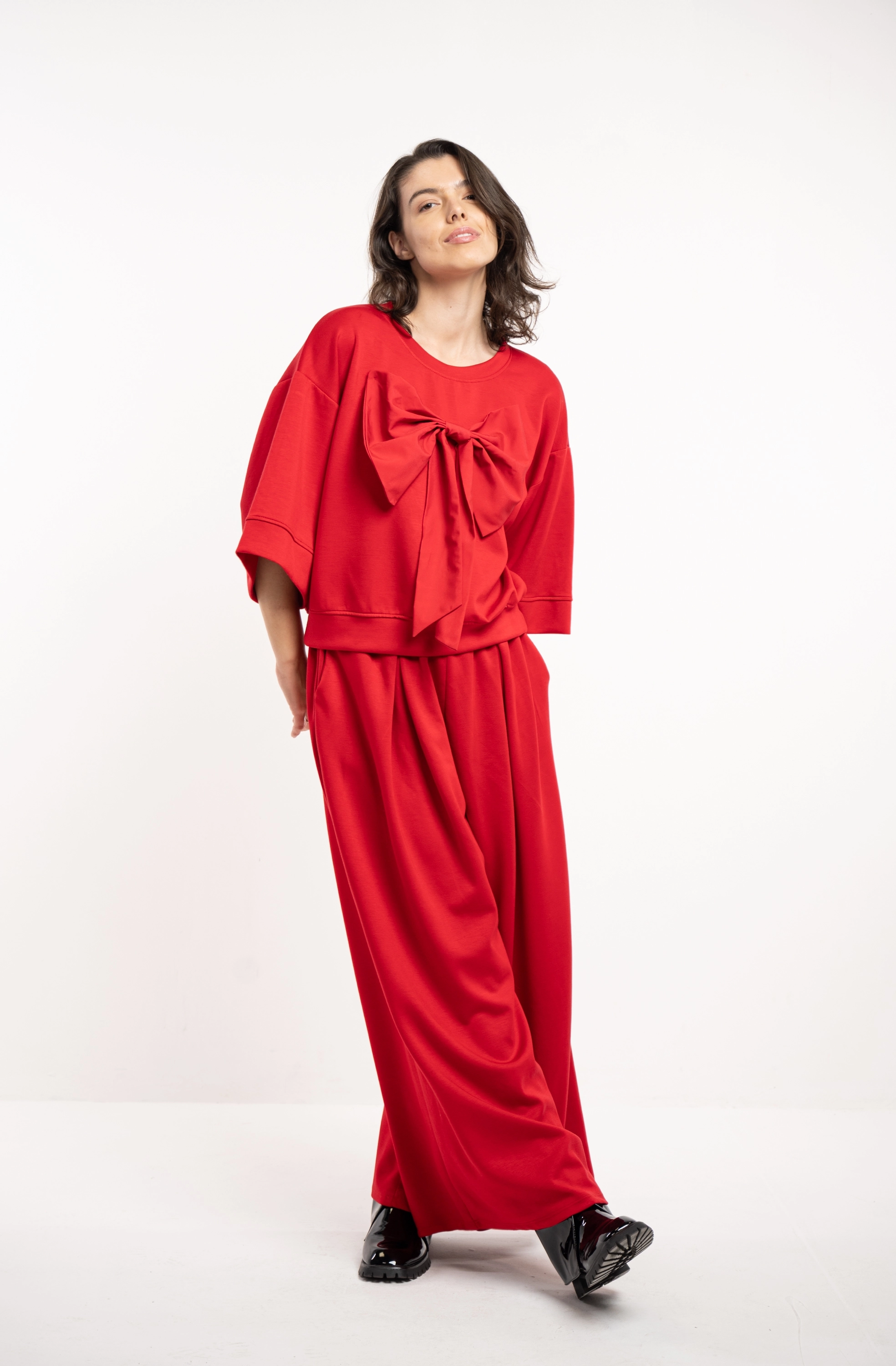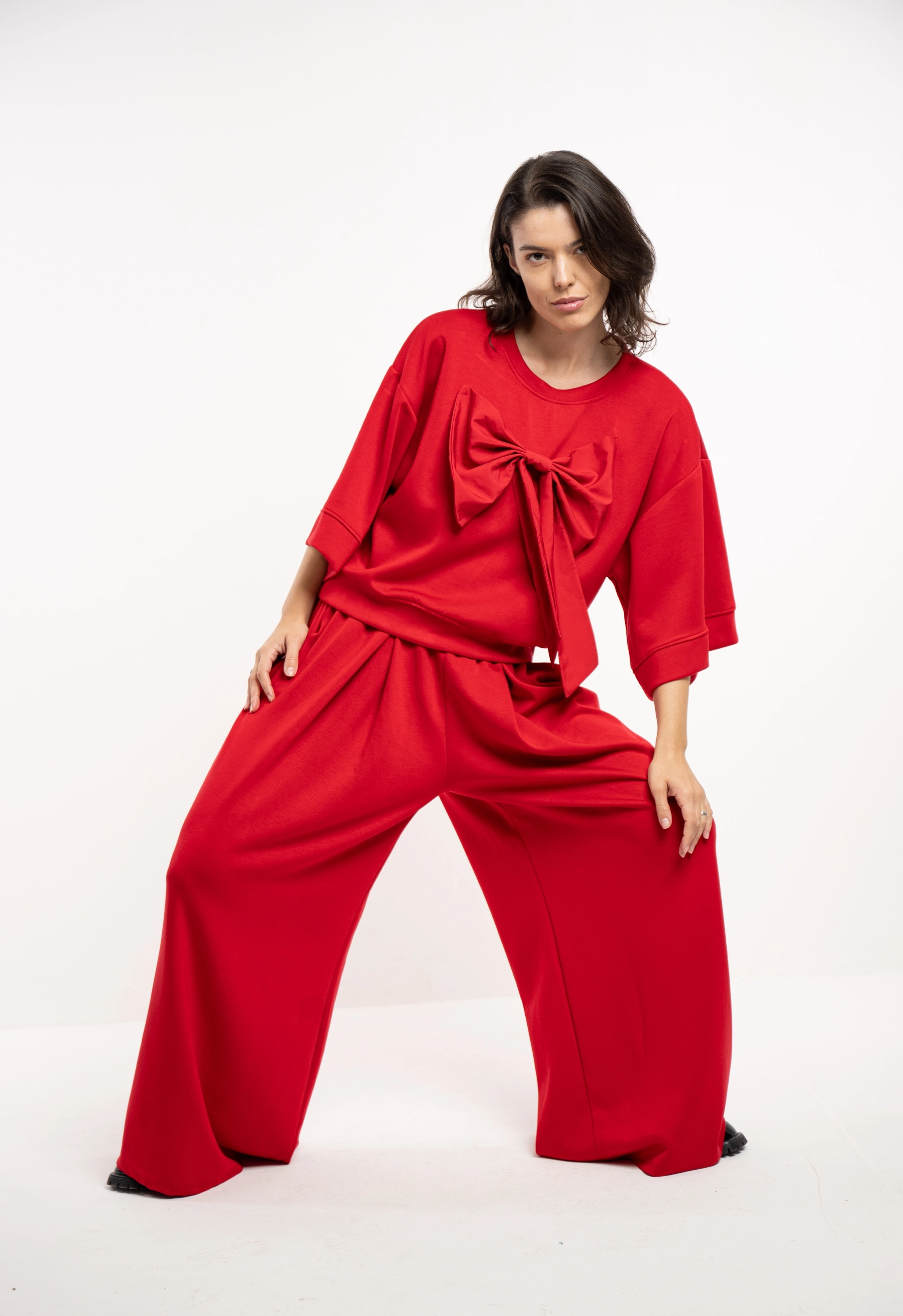 Descriere: Compleu oversized, confortabil. pantalonul este evazat, iar topul are o funda supradimensionata aplicata