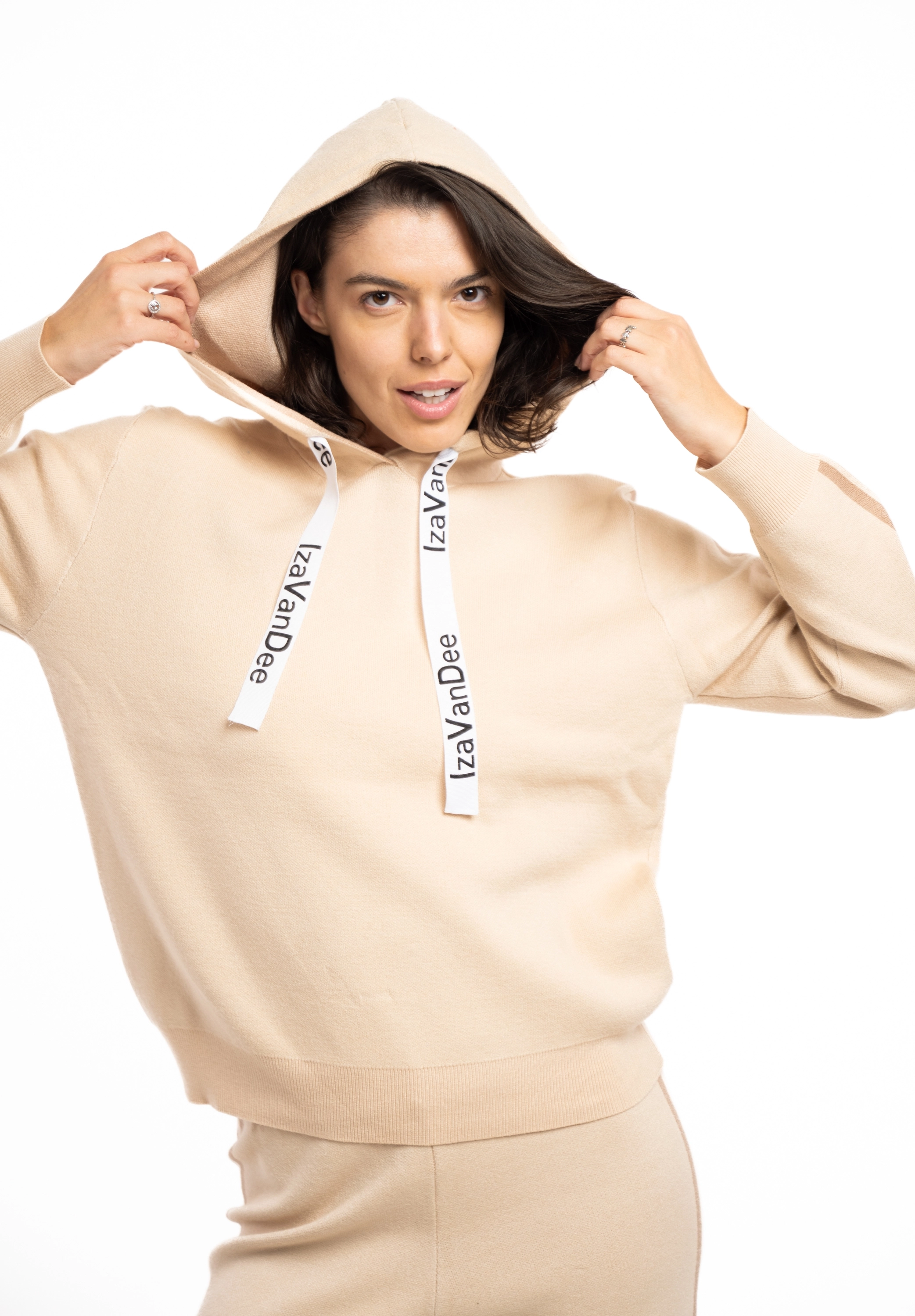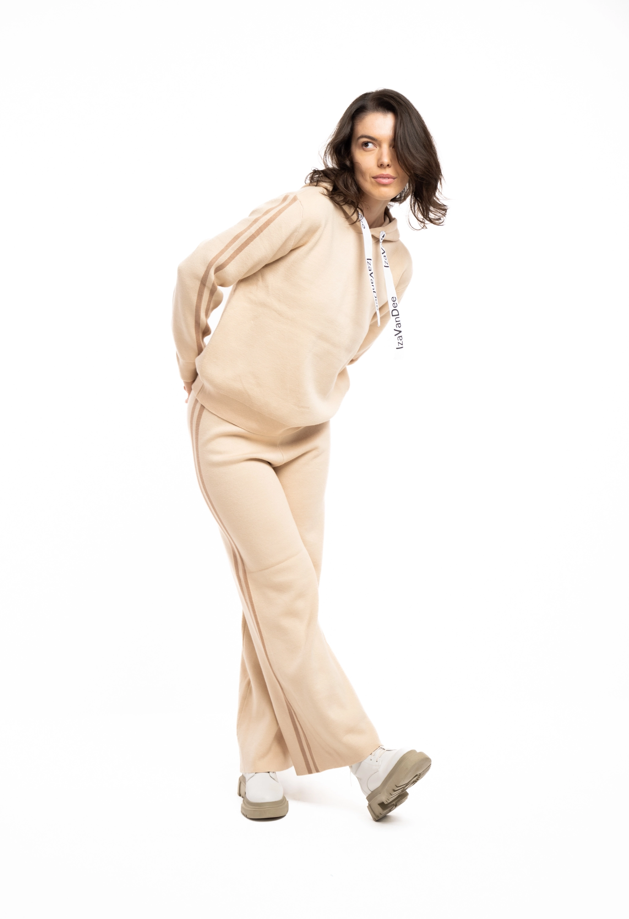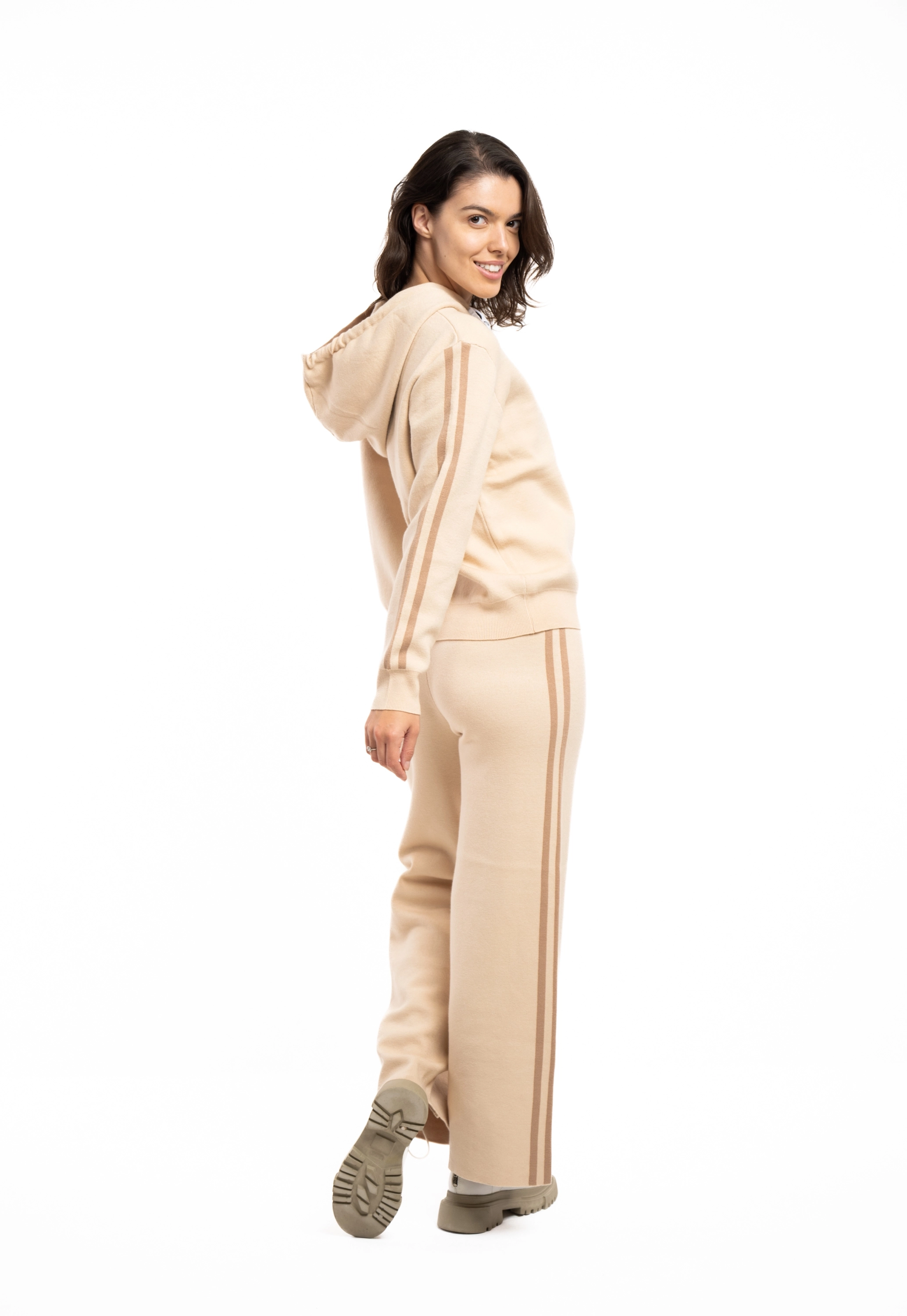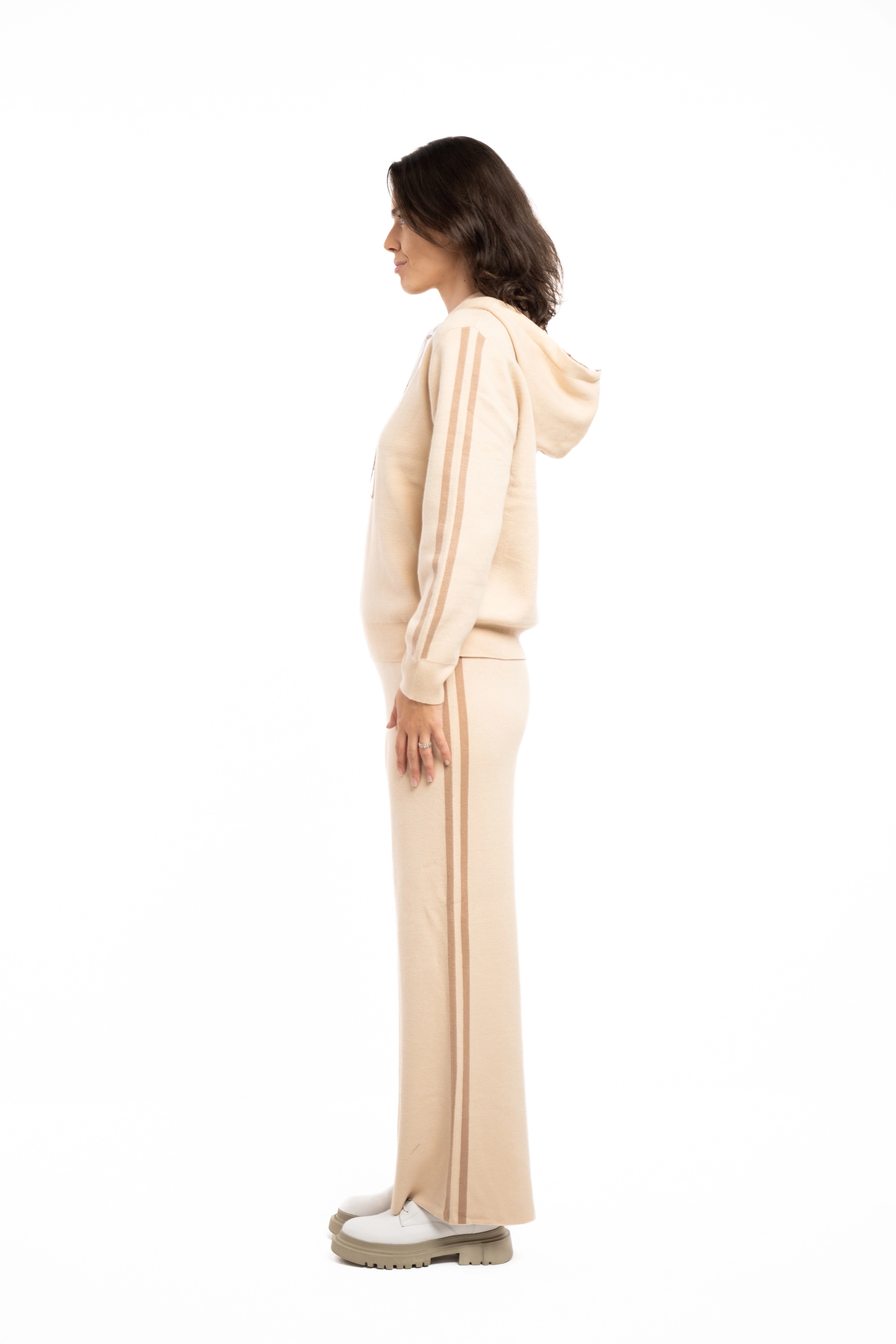 Descriere: Compleu tricot cu hoodie si pantaloni pe talie