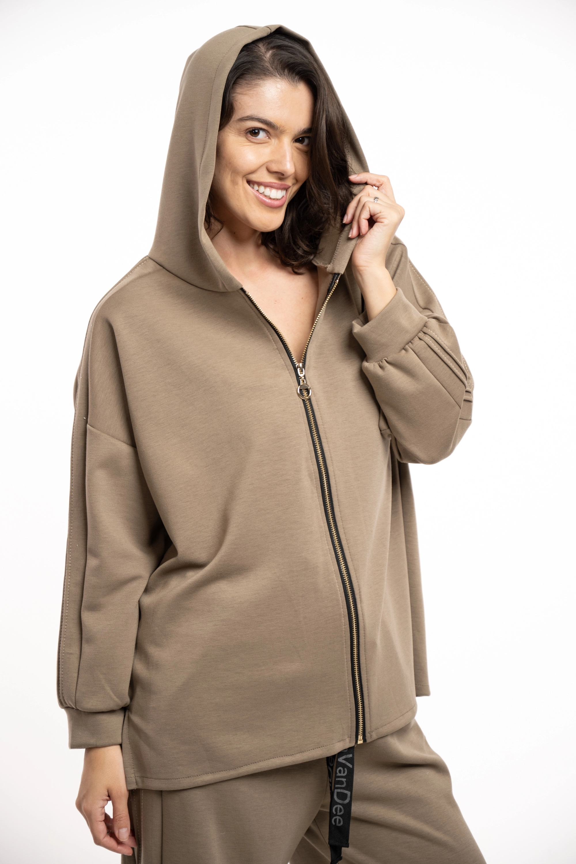 Descriere: Compleu comfy, din material moale, cu hanorac cu gluga