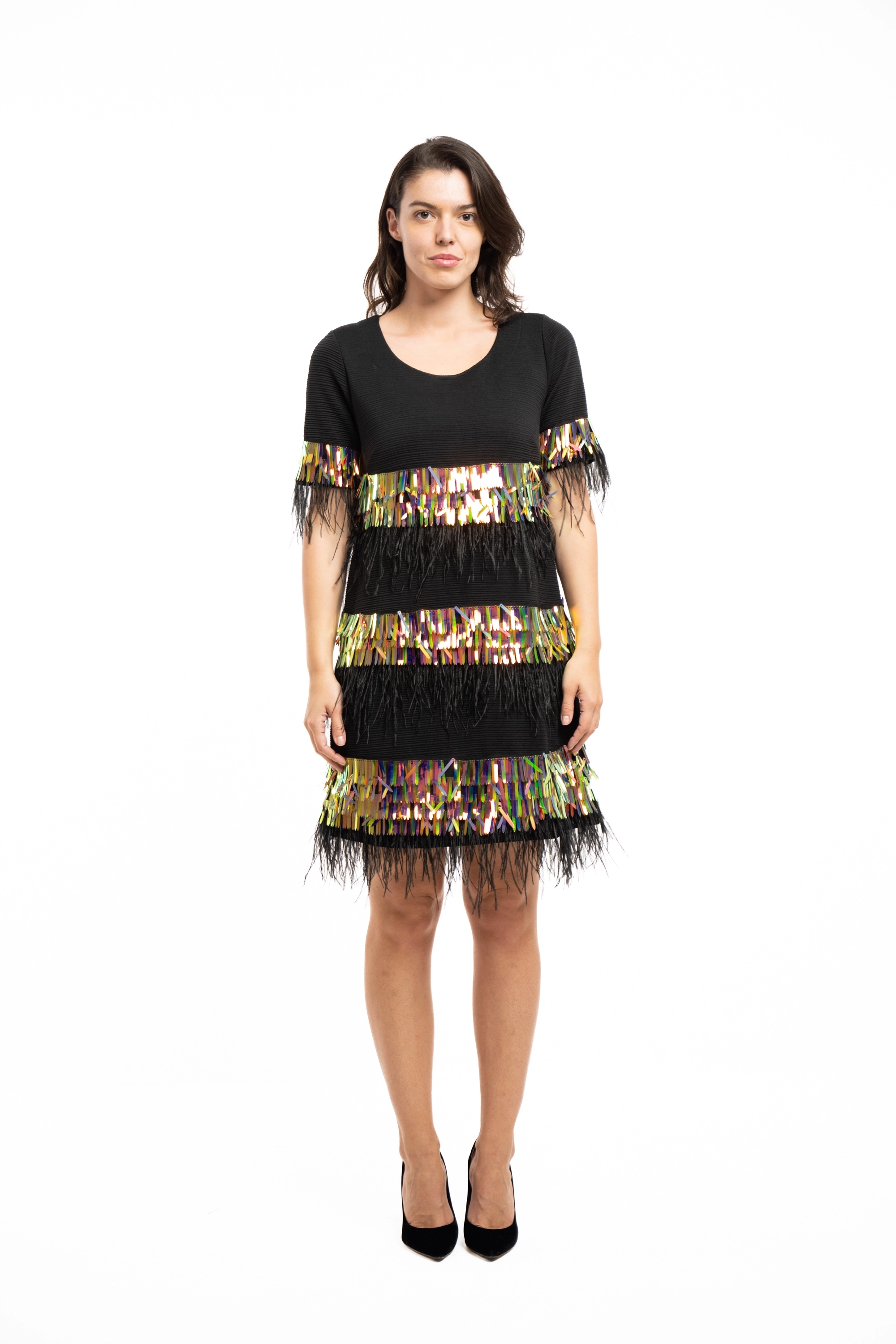 Descriere: Rochie cu aplicatii stralucitoare si pene