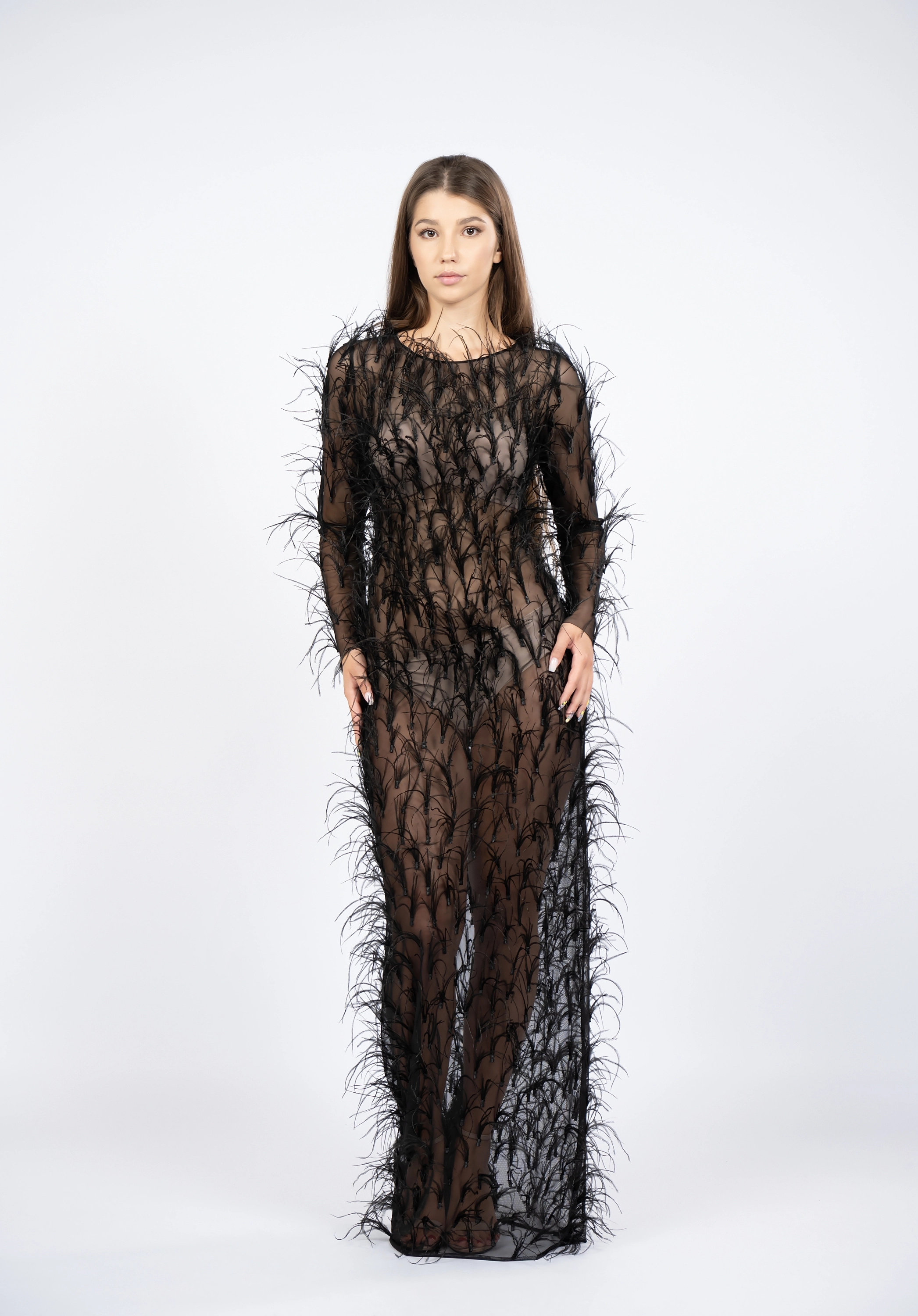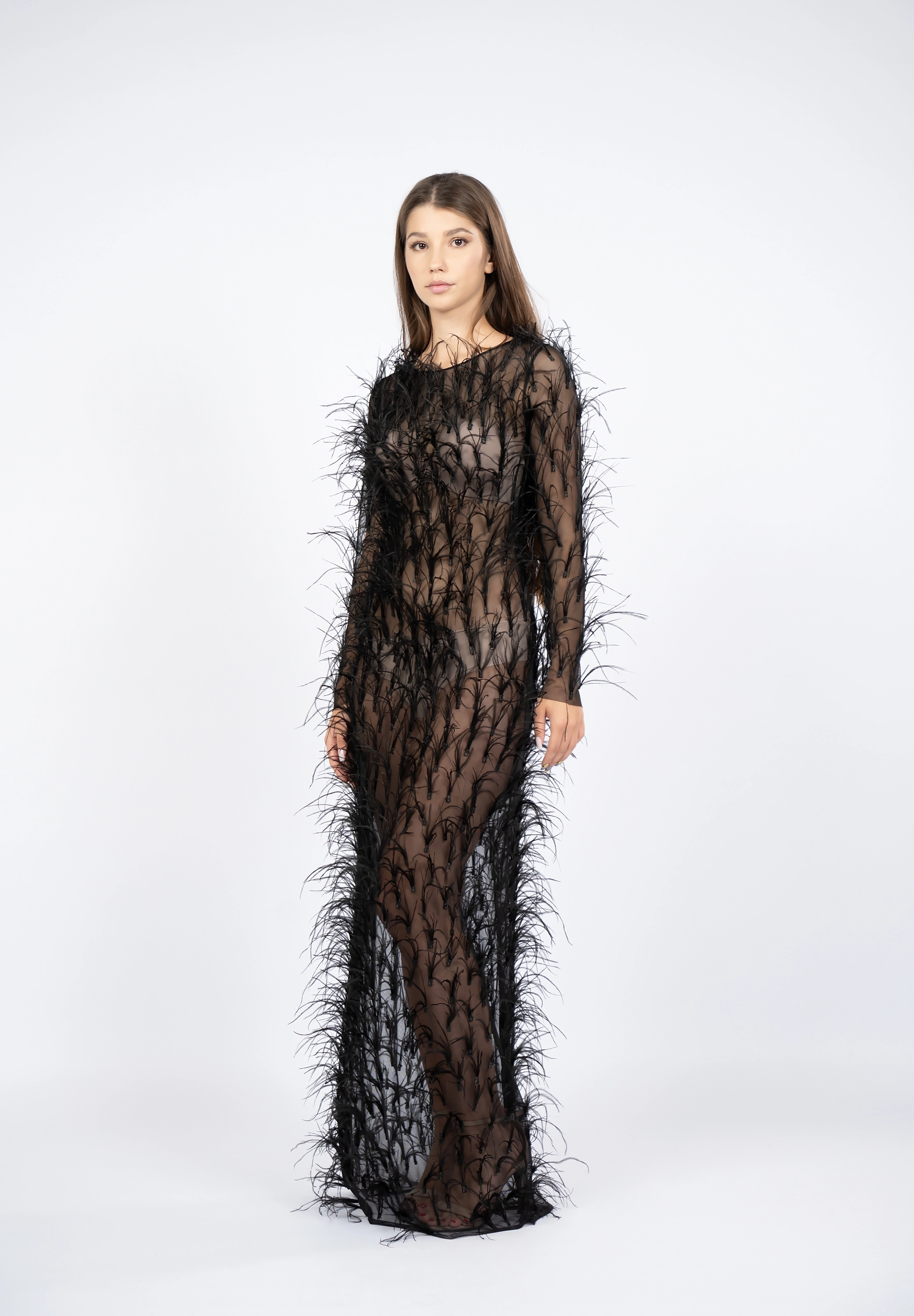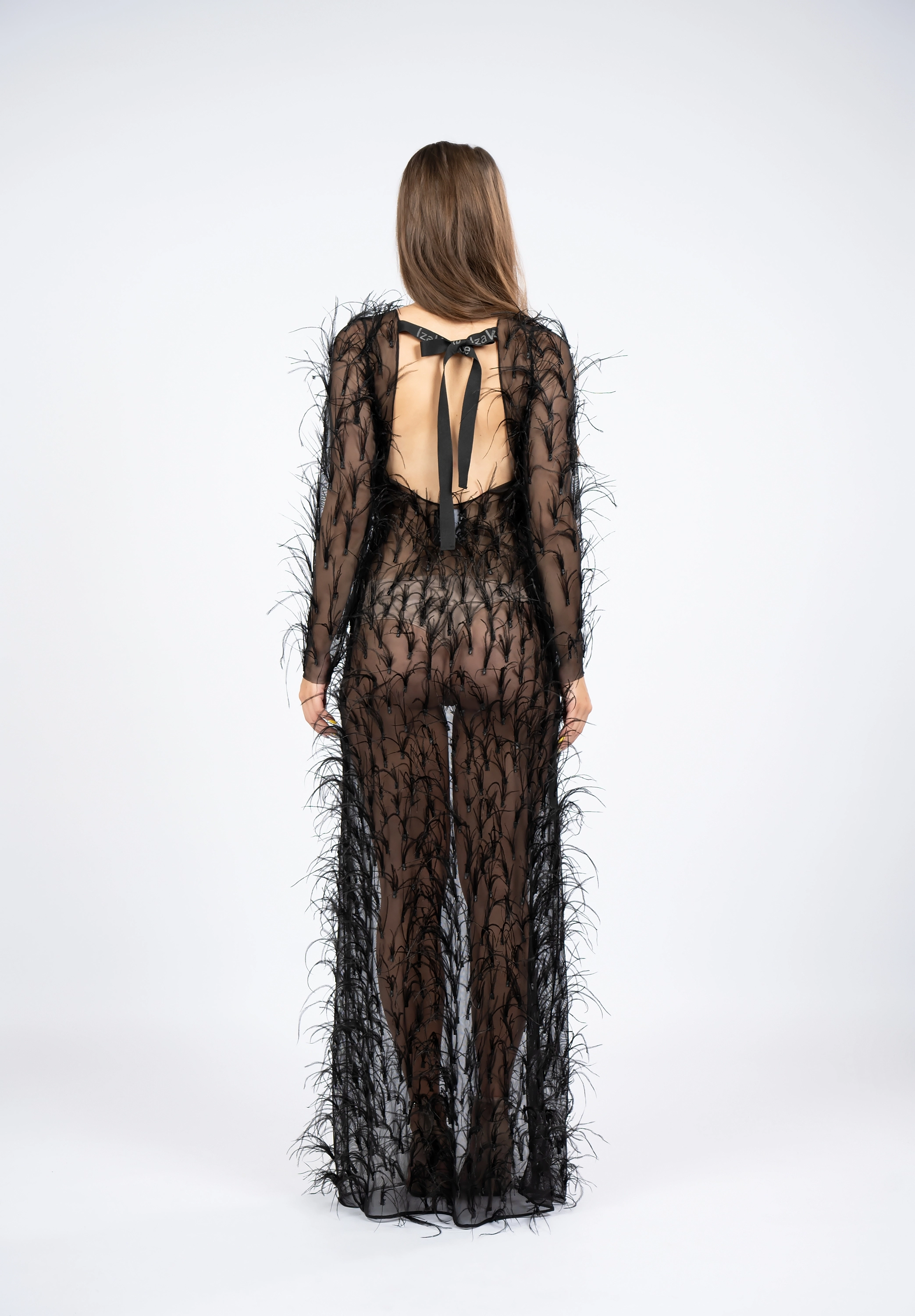 Descriere: Rochie eleganta, semitransparenta cu aplicatii cu pene si spatele gol.