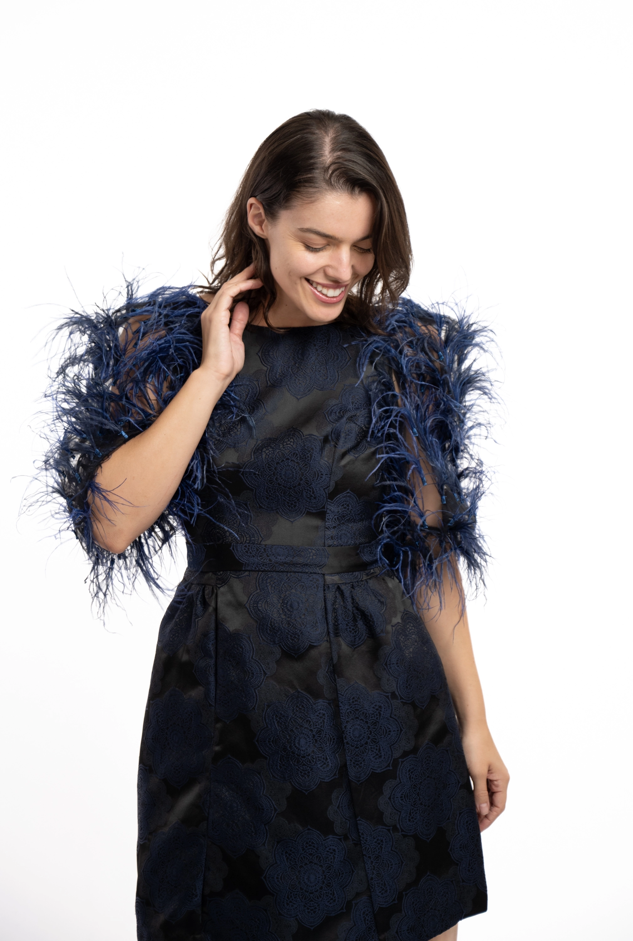 Descriere: Rochie eleganta, cu aplicatii pene pe maneci